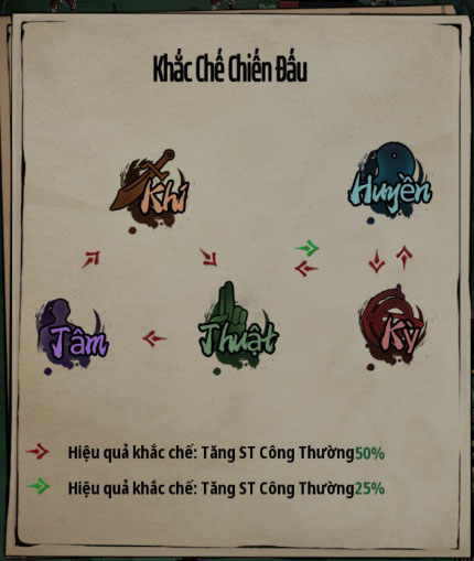 - Chiến thuật: Khi dùng hệ khắc được đối thủ (ví dụ dùng hệ Thuật đánh hệ Huyền), sát thương đòn đánh thường của bạn sẽ được cộng thêm 25%.