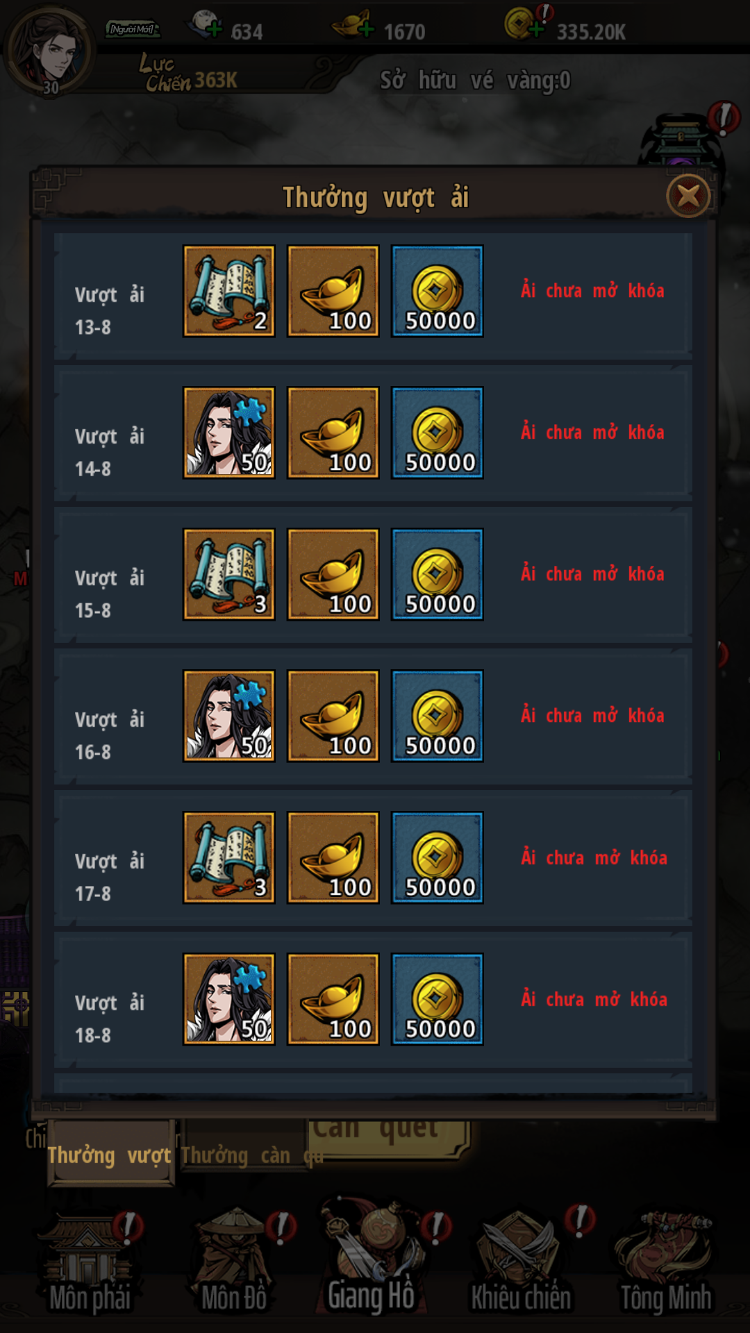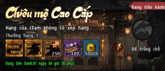 - Mỗi ngày nhân sĩ đều có thể nhận 10 Thiệp Anh Hùng Cao Cấp dùng để chiêu mộ môn đồ.