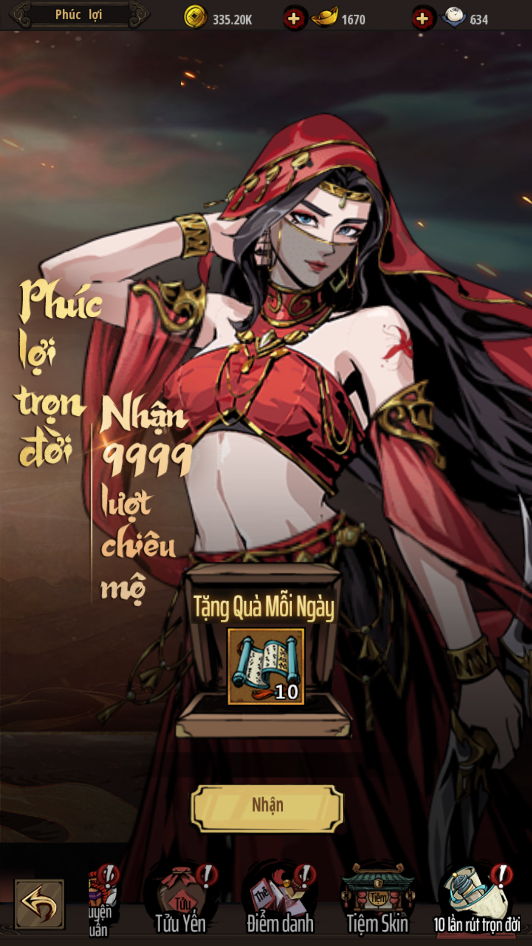 - Nhân sĩ online đủ thời gian là có thể nhận ngay quà phục vụ mạnh hóa, đặc biệt cung cấp thêm Thiệp Chiêu Mộ Anh Hùng Cao Cấp!