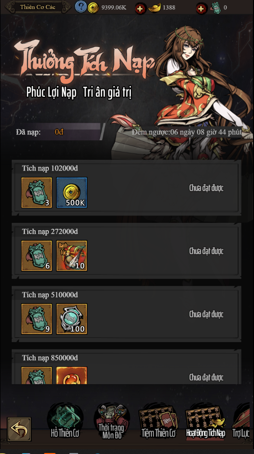 Ở Hoạt động tích nạp, khi các Chưởng Môn nạp đạt các mốc sẽ nhận được các vật phẩm xịn khác nhau như: