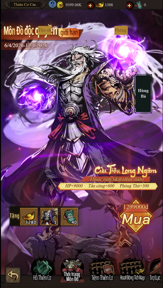 Cánh cửa Thiên Cơ Các chỉ mở ra cho những vị Chưởng môn đủ bản lĩnh và vận khí. Hùng Bá đã sẵn sàng xuất thế, skin Cửu Tiêu Long Ngâm đã chờ người xứng tầm khoác lên, các vật phẩm cực kì có giá trị đang đợi được nhận. Đừng để lỡ mất thiên cơ, hãy lâm trận ngay hôm nay để khẳng định vị thế độc tôn và viết nên huyền thoại mới của riêng mình.