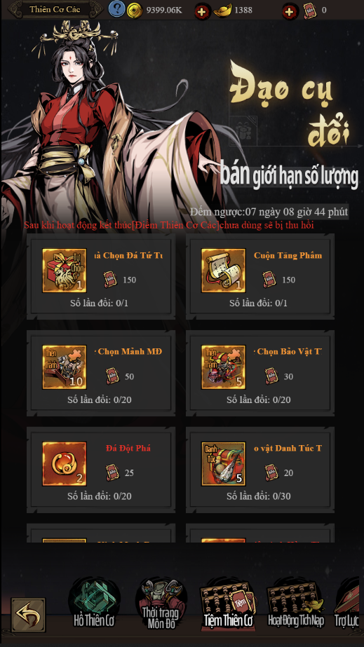 - Thiên Cơ Lệnh: Dùng tiêu hao ở HĐ Thiên Cơ Các, hoạt động kết thúc thu hồi đạo cụ, mỗi cái hoàn trả 20 vạn Xu.