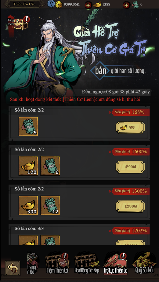 Ở Trợ lực thiên cơ, khi các Chưởng Môn tiêu KNB và mua các gói được liệt kê ở các mốc sẽ nhận được các vật phẩm xịn khác nhau như: